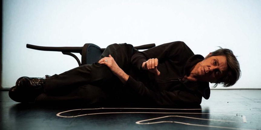 Sur la scène écrin du Studio de création du TnBA, une imposante silhouette encapuchonnée gît. Autour d’elle, tracé à la craie, un trait dessine la forme de son corps plaqué au sol. Derrière elle, un mur blanc. Une chaise renversée complète ce décor minimaliste. Tous les éléments d’une scène de crime prisée par les séries télévisées reviennent en mémoire. Mais là, il ne s’agira pas d’identifier le coupable mais t’entendre cet homme nous raconter l’heure qui précéda sa mort.