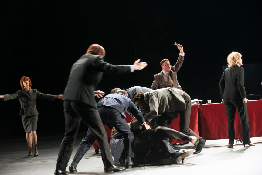 Mais peut être plus encore que cette construction narrative osée et son sujet casse-gueule, c’est le théâtre de Pommerat et sa traduction sur la scène qui nous emporte très loin. Avec ses acteurs, sa troupe tout entière, il nous embarque pendant plus de quatre heures dans un vaisseau à la course folle. Pas de temps mort, pas d’ennui à l’horizon. C’est à un prodigieux travail des comédiens (14 au total, 3 ou 4 rôles chacun) auquel on assiste émerveillé. On le doit au long travail sur le plateau qui a préfiguré la création de ce spectacle. Une prouesse sans doute mais un talent individuel sans conteste mis au service du collectif et du texte. Tour à tour sur le plateau et dans le public, vociférant, s’invectivant, nous faisons corps avec les comédiens, immergés au centre des débats des comités de quartier, de l’ assemblée nationale en effervescence, dans le bureau du roi avec ses conseillers à Versailles, au cœur de la révolution. On s’y croirait car on y est vraiment, Jouant le peuple que nous sommes. C’est beau et c’est bien trop rare à voir sur les planches aujourd’hui.
