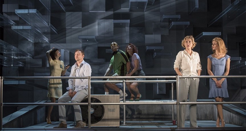 Le rideau s’ouvre. Nous sommes sur la terrasse d’un gratte-ciel, au 49ème étage. C’est là que les employés d’une entreprise financière montent pour fumer en cachette bravant l’interdiction mais aussi pour s’épancher, converser, draguer, comploter… De grands panneaux de verre, fixés horizontalement en fond de scène apportent une dimension futuriste et inversent les perspectives. Nous voyons ceux que les employés voient en regardant en bas : des gratte-ciels à perte de vue. Le décor est planté, majestueux, il n’y a aucun doute nous sommes au « Français ».