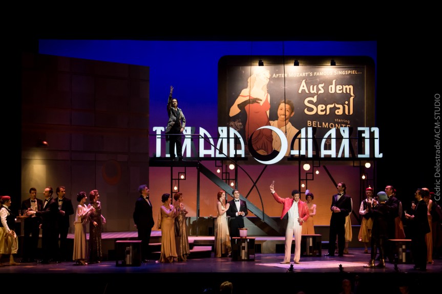 Emmanuelle Cordoliani place l’action dans un cabaret de Vienne des années 1930. Le pacha Selim en est le tenancier, Belmonte est un chanteur de charme à succès et Constance une meneuse de revue. Dans l’atmosphère interlope du lieu ces artistes en vogue vont présenter le fameux singspiel de Mozart. Ce théâtre dans le théâtre commence comme un spectacle de cabaret dans une ambiance délétère devant un public qui semble plus intéressé par les plaisirs dionysiaques et libidineux du lieu que par le spectacle. Puis, progressivement, le cabaret devient sérail, le spectacle prend forme et commence vraiment lorsque ce petit monde de jouisseurs un peu encombrants quitte la scène pour laisser enfin toute sa place à Mozart dans le magnifique air de Constance « Martern aller arten… », l’un des sommets de sa musique lyrique, interprété avec conviction et virtuosité par Katharine Dain.