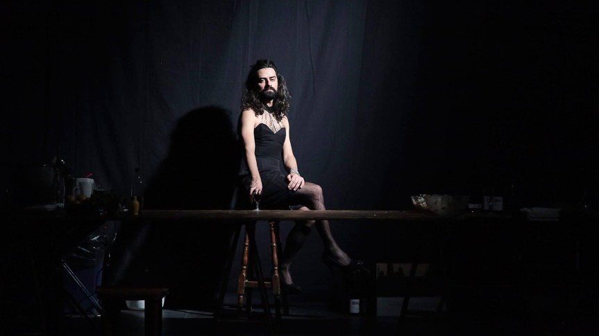 Taste me (Acte II). Nous nous sommes maintenant transportés dans le grand hall de cette ancienne Manufacture de Chaussures transformé pour l’occasion en salle à manger. Assis par petits groupes derrière des tables basses, nous sommes conviés à goûter une spécialité iranienne préparée devant nous par Gurshad, et arrosé de vins servis par lui. Dans une petite robe noire seyante et chaussé d’escarpins (la tenue de sa mère à qui est dédié ce repas), tout en nous informant des rituels culinaires de son pays, il nous parle de la figure centrale de cette mère, contrainte à abandonner ses ambitions universitaires du fait de la nouvelle constitution iranienne basée sur la charia. Il nous confie son attachement à elle et sa méprise à lui sur le sens des paroles d’une chanson de Patricia Kaas qui passait en boucle (les hommes qui passent… pour un mois, pour un an), entendues comme « pourama, pourama » (titre donné au spectacle). Cette mère qu’il affectionnait tant – et la réciproque était tout aussi vraie – qu’il en épousa les désirs jusqu’à se laisser, lui, troublé par la beauté d’un steward auquel elle n’était pas insensible. Par la suite – il a à peine quatorze ans – il tombera amoureux de Jean-Louis, l’amant de sa mère au sexe amputé, qui l’initiera au plaisir des caresses.