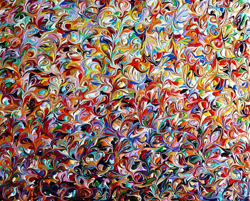 Guelfenbein utilise principalement l’acrylique. Tout en relief, ses tableaux peuvent se toucher, puisque la matière ne bouge pas. Soucieux de l’environnement et du gaspillage, il réutilise certains matériaux pour en faire des portraits pour le moins étonnants que l’on peut également découvrir dans cette belle exposition de la Valverde Art Gallery. Les noms donnés à ses œuvres sont aussi poétiques et parlants que ses couleurs : « Soulful » ; « Sensing » « Floating » ; « Blue Planet » ; « Relax » ; « Ephemeral » ; « Alive » ; « Allegro » et bien d’autres. « Heavenly », et sa technique particulière, a spécialement été créée pour la Gallerie de Marc Valverde.