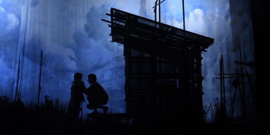 Denis Podalydès propose ici un Marivaux des plus classiques dans la forme, une production qui repose avant tout sur une redoutable efficacité non exempte de poésie et d’esthétisme. L’action se déroule sur les lieux de retraite du philosophe dans un coin de marais entouré d’herbes folles et d’oiseaux, sur un fond de brume quasi magique d’où l’on pourrait voir surgir elfes et autres créatures mythiques. Une musique mystérieuse, magnifiquement interprétée au violoncelle par Christophe Coin, enveloppe les comédiens et de subtils jeux de lumières, associés à des tissus chatoyants, peignent de délicats tableaux dans des clairs-obscurs dignes du Caravage.