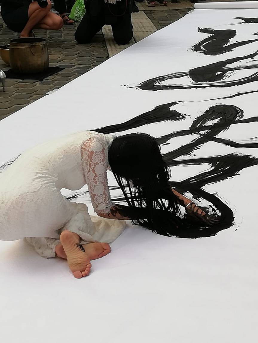 Entre calligraphie chinoise, art corporel, confections, Kaixuan a ouvert l’exposition en peignant avec ses cheveux imprégnés d’Encre de Chine ! Vous avez bien lu, avec ses cheveux, l’artiste a tracé des caractères géants sur une toile monumentale à même le sol, en pleine rue, transformant ainsi son corps en pinceau ! Une série de ces toiles particulières exposées sous le thème « Cheveux d’Encre » sont des œuvres ayant toutes été réalisées de la même manière : entourée ou devant un public nombreux (certaines d’entre elles ayant parfois rassemblé plusieurs centaines, voire des milliers de personnes). Pour elle, chacune de ses performances devient un « exercice rituel » une « occasion de métamorphose et de réincarnation ». Pour l’occasion elle confectionne une nouvelle robe de couleur blanche, en soie, en dentelle ou autres textures. La robe est imprégnée de l’encre qu’elle utilise avec ses cheveux, n’est pas lavée et devient une œuvre d’art que l’artiste expose avec le reste de son travail. « La robe, nous dit-elle, représente un vécu ; une vie et devient d’elle-même une œuvre ». Devant la Valverde Gallery, elle trace le mot « SAHẲ » qui veut dire « notre monde », à savoir, « le contraire du Nirvana », nous explique Kaixuan, « nous vivons avec nos difficultés dans ce monde qui est notre vie et nous devons l’accepter telle qu’elle est ». Le fait de peindre sans les mains est « se libérer des outils » ; « avoir les mains vides c’est comme l’amour : quand tu n’as rien dans les mains, que peux-tu donner ? » « C’est une façon de se libérer de soi-même aussi et de rejoindre quelque chose de plus lumineux ; rejoindre le grand Moi en oubliant le petit Moi ».