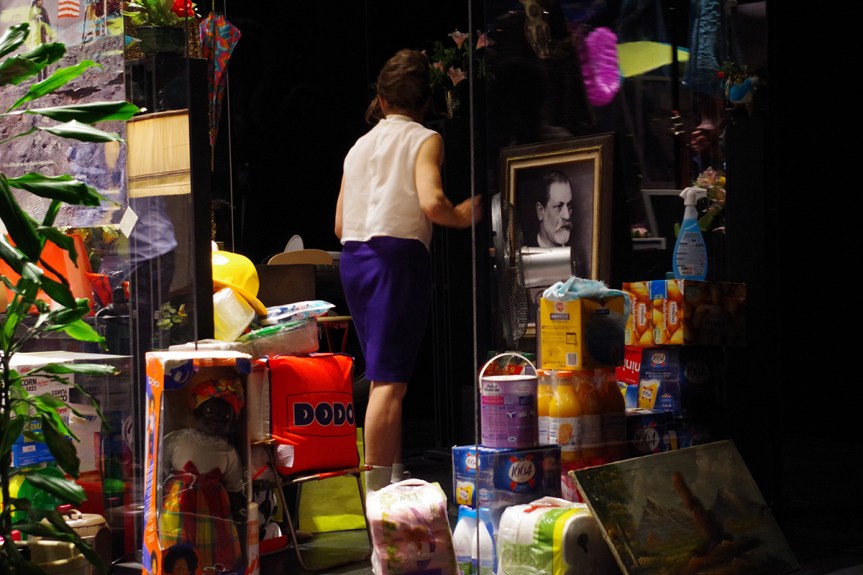 Pendant une heure, jusqu’à épuisement, jusqu’à ce que les espaces saturent d’objets en tous genres, les interprètes de Maguy Marin vont ensevelir la scène de tout, aussi bien de paquets de lessive que de croquettes pour chien, de bidons de lait que des pacs d’eau…