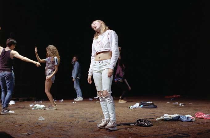 La scène est recouverte de terre et jonchée de détritus. La puissance de la musique électronique invite les esprits et les corps à la transe. Néanmoins, les personnages investissent avec lenteur ce territoire désaffecté. Ralentis mais pas retenus, comme en apesanteur mais toniques. Ils sont jeunes, on le perçoit à leur habillement. Encapuchonnés, chaussés de basket, cannettes à la main. Certains se reconnaissent, d’autres se toisent. Des visages expriment la joie et l’heureuse attente de la fête, l’anxiété ou encore l’indifférence. Les mouvements s’accélèrent, deviennent saccadés, pourtant toujours à l’unisson. Puis, comme si quelqu’un avait appuyé sur la touche pause, tout s’arrête, sauf pour un ou deux protagonistes. Focus sur eux. Puis l’ensemble reprend, l’espace est totalement investi. Echanges, disputes, rencontres, désirs, caresses, fusions, agressions, réconforts, regards. Mouvement de foule imperceptiblement conjugué. Et stop. Silence. Immobilité. Photo de groupe ? Alors à nouveau la danse, comme une houle. Vitesse, gestes décalés, cris, rires, signes, chutes, pleurs. Unions et désunions. Plaisir et chagrin. Douceur et violence. Les enjeux vitaux de l’adolescence.
