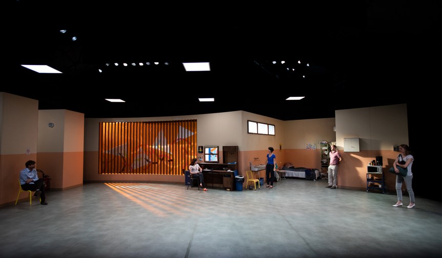 Dans quel décor évoluent-ils ? Celui de l’absente. Le décor nous plonge immédiatement dans son univers à la fois professionnel et privé. En effet, nous découvrons à jardin, un hall, sa loge, lieu de passage où elle travaille, accueille, décide des entrées et des sorties, puis à cour, son modeste logement qui se réduit à un lit et quelques meubles.