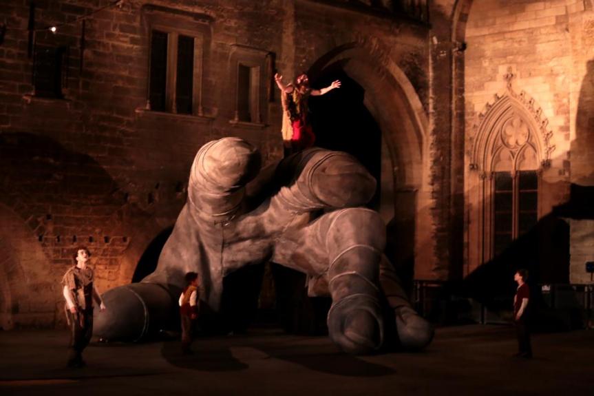 Sous « le Ciel, la nuit et la pierre glorieuse » – titre donné en 1947 par Jean Vilar à l’an I du Festival, repris en 2016 par Thomas Jolly pour son feuilleton donné dans le jardin Ceccano – de la Cour d’Honneur vibrante sous l’effet d’éclats sonores et lumineux, dans un décor rappelant un tableau de Magritte (intitulé « La Mémoire » où d’un gigantesque visage s’écoule des filets de sang), une monumentale tête côté jardin, et une main tout aussi géante côté cour, trônent. Elles saturent l’espace de leur présence immobile et leur inquiétante étrangeté résonne en nous comme les signes subliminaux annonciateurs du funeste destin qui attend les enfants de Thyeste. A mi-chemin, à l’exact « centre de la scène » – car c’est là où s’origine la tragédie des Atrides qui aurait dû, si l’on rend à César ce qui lui appartient, se dénommer la tragédie des Tantalides, Tantale étant celui qui a commis l’impensable, « la faute » originelle d’avoir, par pur défi, offert son fils Pélops en festin aux Dieux – se situe l’impluvium d’où sortira le fantôme du grand-père d’Atrée et de Thyeste, les frères maudits.