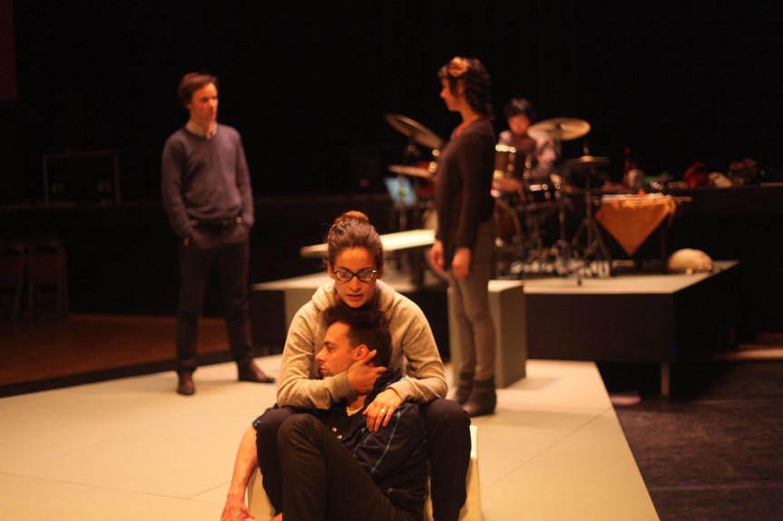 Liam et Rachida tombent amoureux l’un de l’autre. Liam est de milieu rural, défavorisé et vit de trafics de drogue. Rachida, d’origine maghrébine et musulmane mise beaucoup sur l’école pour prendre son envol et s’affirmer hors du cadre familial. Annie et Pascal s’éprennent également l’un de l’autre. Annie se débat pour retrouver un travail et un logement afin de récupérer ses enfants. Pascal, photographe, issu de milieu bourgeois, est pour la première fois confronté au chômage et à la précarité. Nous suivons le parcours de ces deux couples : leur rencontre, leur rapprochement, leurs moments de tendresse jusqu’au premier acte de violence et ses conséquences. Le décor est sobre : les comédiens évoluent sur une scène triangulaire, surplombée au fond, d’une plate-forme sur laquelle une musicienne joue de la batterie, et prolongée devant, par un rectangle nu qui fait office tantôt de lit, tantôt de table. Deux fauteuils et une table créent comme une passerelle entre la musicienne et l’espace dédié aux deux couples.