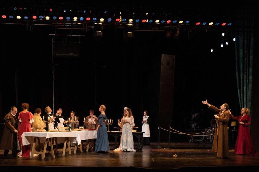 Première partie, le rideau se lève et dévoile le plateau mis à nu du Français, nous sommes au théâtre, dans un théâtre, celui de la famille Ekdahl, comédiens de mère en fils. Et pourtant, c’est la vie qui surgit. La famille investit la scène, les coulisses, la salle, les couloirs pour célébrer le théâtre. C’est Noël, le temps est aux rires, à la joie, aux retrouvailles, aux doutes, à l’introspection et aux disputes aussi. La vie sous toutes ses couleurs. Le commencement est festif et joyeux autour d’Oscar et Émilie, maîtres des lieux, père et mère de Fanny et d’Alexandre. Le propos se densifie progressivement. Des joies viennent les questionnements sur l’art dramatique, sur les relations amoureuses et familiales et sur les états d’âme de chacun. Le rideau tombe enfin, sur une issue fatale, la mort d’Oscar. Saisissant moment où le public, le vrai, se lève, s’étire, discute… c’est l’entracte, alors que des cris et des pleurs se font encore entendre derrière le rideau… De quel côté est le vrai, le faux ?