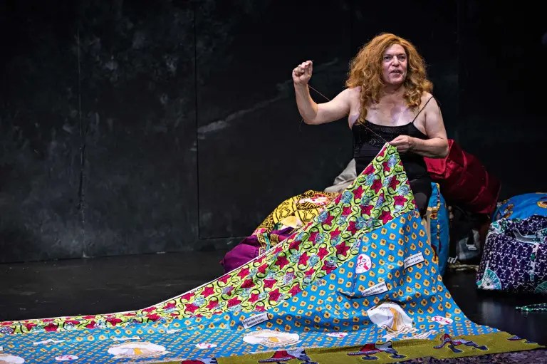 Raoul Fernandez, caméléon, semble maîtriser toutes les facettes du métier d’acteur et on comprend alors aisément que Stanislas Nordey l’ait découvert alors que Raoul passait simplement sur scène avec une robe qu’il transportait d’un point A à un point B ! Les scènes s’enchaînent avec entrain passant des larmes aux rires en quelques secondes, faisant rire un public entraîné comme par exemple cette scène folle d’un père courant avec son fils mort dans les bras, l’un des frères de Raoul. La carapace de plumes et de strass de Raoul se fendille alors lorsque la figure maternelle disparaît dans les nuages laissant un grand vide dans l’âme de ce poète de la vie.