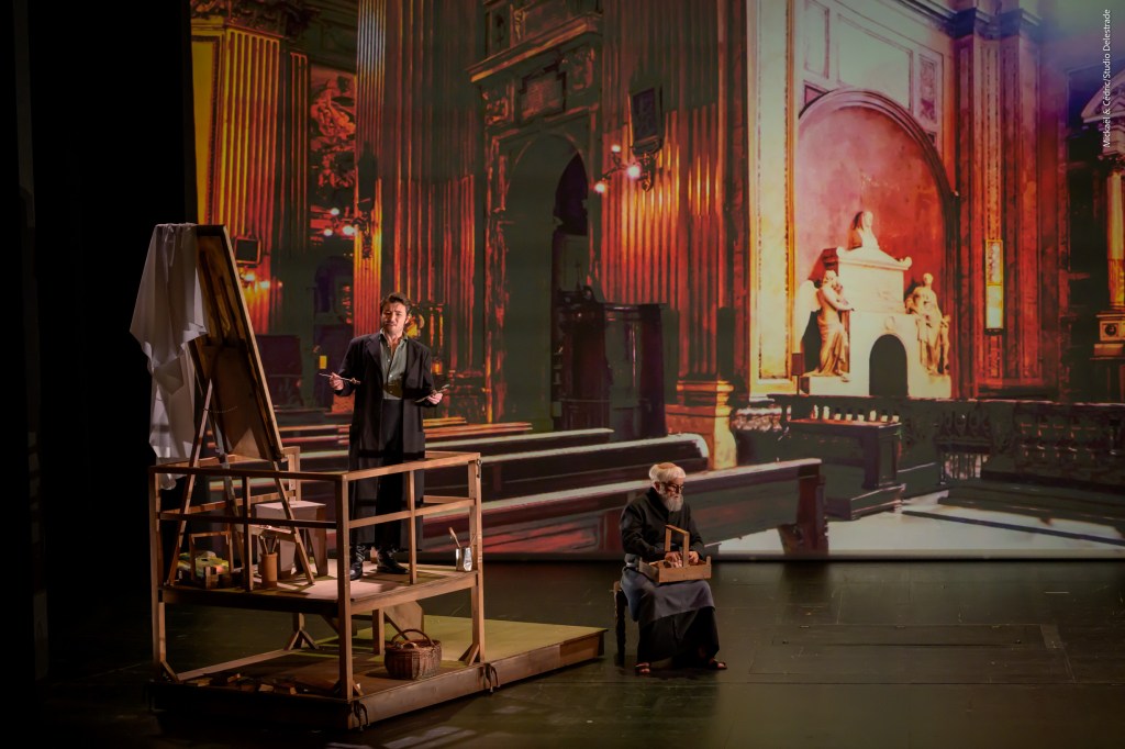 Chaque lieu est représenté par des projections en fond de scène d’images prises in situ par Julien Soulié qui constituent en fait l’essentiel du décor, celui-ci étant complété par quelques accessoires de scène comme l’échafaudage sur lequel peint Mario Cavaradossi, tables et chaises dont la grande table de banquet de Scarpia munie de ses célèbres candélabres et une immense colonne d’église. L’action utilise en outre largement une trappe située en milieu de scène qu’on a du mal à imaginer en chapelle de la famille Attavanti mais qui devient plus crédible quand elle évoque la prison et la salle de torture, lieux des sombres machinations de Scarpia.