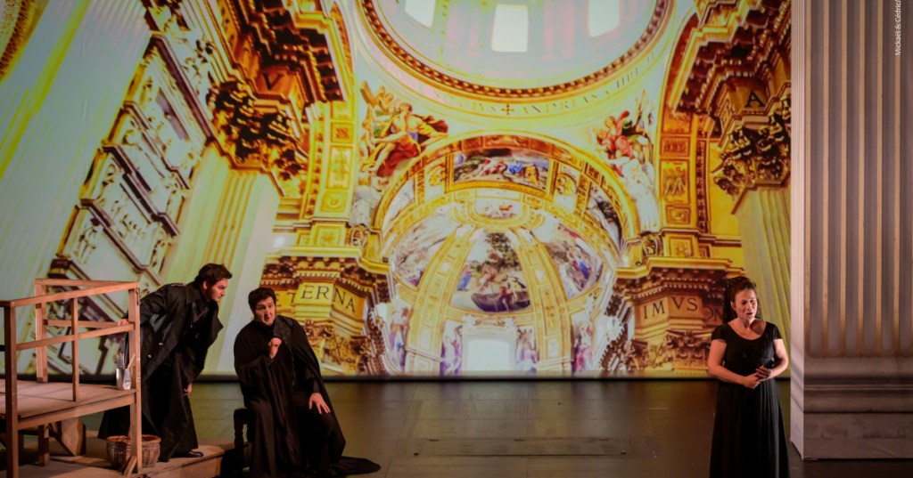 Ces projections évoquent à merveille la magnificence baroque de l’église Sant’Andrea et du Palais Farnèse ou l’austérité des prisons du château Saint-ange. Des images parfois mouvantes, créant une impression de vertige. Un procédé bienvenu quand il évoque les déséquilibres et les troubles que ressentent les personnages mais parfois superflu comme dans l’air « Vissi d’arte », ou des images défilantes en fond de scène nuisent à l’attention du public et à l’émotion du moment. La scène finale qui voit Tosca se jeter dans le vide sur les remparts du Château Saint-Ange présente une silhouette sombre qui semble planer au-dessus de la ville de Rome. Si cette image peut représenter l’envol d’un ange on peut regretter qu’elle gomme toute la brutalité de cette scène, point d’orgue dramatique de l’opéra.