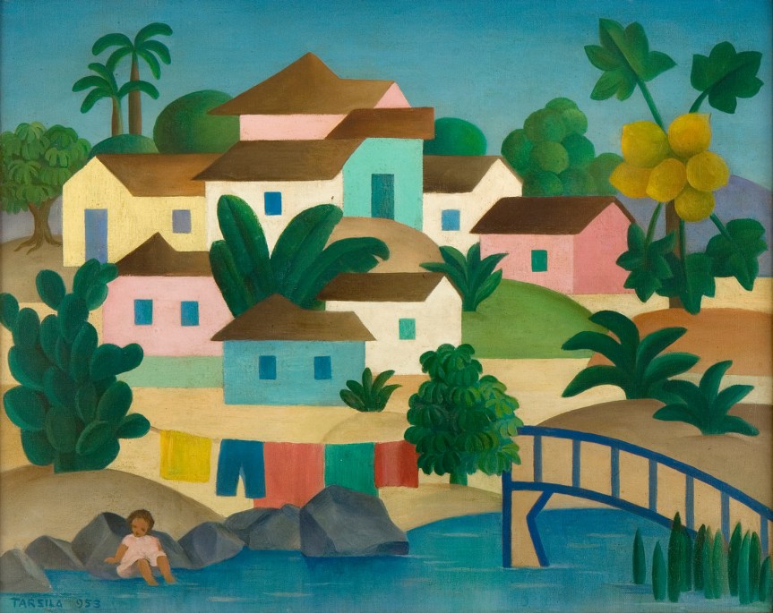 Image : Tarsila do Amaral. Vilarejo com Ponte e Mamoeiro. 1953. Óleo sobre tela. 41 x 52 cm. Coleção particular, São Paulo, SP – Foto: Romulo Fialdini – Catálogo Raisonné Tarsila do Amaral v. I p.243 P199