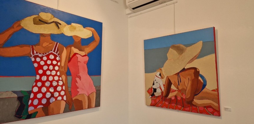 Jusqu’au 1er juin, le public a pu découvrir et admirer une artiste solaire : Sophie Dreyfus. Avec sa série « Soleils Bleus » : des baigneuses et surfeuses, en pankini ou en maillot une pièce, libres comme le vent, dans un environnement coloré, lumineux, doux et chaleureux, au bord de la plage, devant l’océan ou simplement étendues sur le sable. Les grandes toiles attirent irrésistiblement le regard et enveloppent les visiteurs d’un hâle de bien-être, d’apaisement, de paix et surtout de joie. Un sourire de plénitude se dessine sur les lèvres de chacun d’entre eux, les yeux grands ouverts, admiratifs devant les œuvres de l’artiste française.