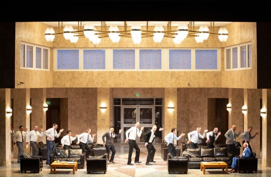 Vous ne pourrez pas admirer l’environnement de la Carmen de Bizet, dans sa ville, Séville, avec son arène, sa place, la montagne ou encore la manufacture de tabac. Dans la version de cet opéra célèbre que propose la Monnaie avec la mise en scène de Tcherniakov, le décor est tout autre. À l’ouverture du rideau, le public est face à ce qui semble être un immense hall d’hôtel, en marbre, avec des fauteuils en cuir sombre, une ambiance plutôt froide et assez impersonnelle. Le propos étant de représenter une clinique nouvelle, spécialisée dans des thérapies expérimentales. Les personnages sont vêtus de costumes cravates et tailleurs gris, ou robes simples toujours dans les mêmes tons. Pas de changement de décor, ni de projection, pour permettre aux spectateurs de créer leurs propres images des différents lieux en fonction de ce que leur évoque le texte ou la musique. C’est un spectacle de directions d’acteurs et actrices qui « va beaucoup plus loin de ce que l’on attend des chanteurs qui doivent être capable de porter les personnages animés par leurs pulsions extrêmement fortes », précise Sébastien Herbecq (*) dans son introduction avant le spectacle. « Il va falloir accepter un parti pris de départ qui est celui de la thérapeutique ».