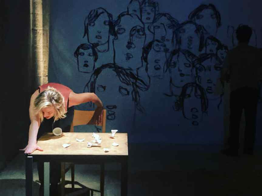 Sophie Cattani nous propose une magnifique interprétation de ce texte, avec retenue, intériorité, comme si la pensée se faisait paroles. En toile de fond durant ce récit, l’artiste exilé Mahmood Peshawa peint une immense fresque, un ensemble de corps entassés dont on ne perçoit que les visages. Des visages hagards, effarés, des regards annonçant un drame à venir.