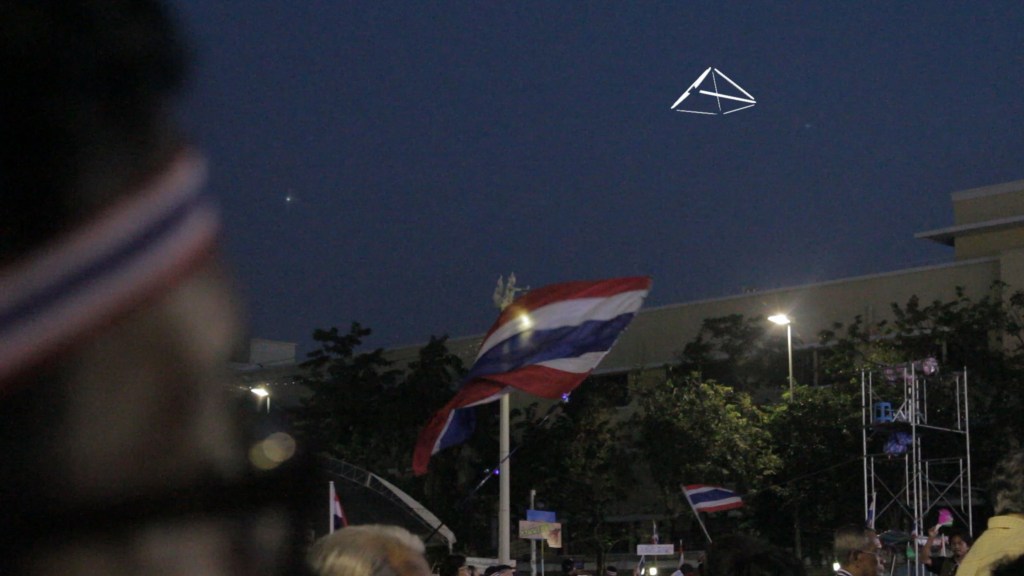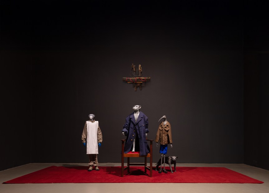 Images: 1- Fuyuhiko Takata, « Japan Erection » (2010), single channel video with sound, 2 min 8 sec. ©Fuyuhiko Takata, Courtesy Fuyuhiko Takata and WAITINGROOM / 2- Jane Alexander, « Council with emblem » (2025), « Monitor » (2023); « Representative in law enforcement jacket », (2006,14), « Bird in Step Out tunic » (2024); « Beast » (2003); « Emblem » (2025). Courtesy Jane Alexander / 3- Chulayarnnon Siriphol, installation view from « Myth of Modernity « (2014), light sculpture, 8 light tubes, 1.20 x 1.20 x 1.00 m, a part of the exhibition FAITH and FAIRY TALES: New Media Art for Thailand, ADM Gallery, School of Art Design and Media, Nanyang Technological University, Singapore. Courtesy Chulayarnnon Siriphol and Bangkok CityCity Gallery.
