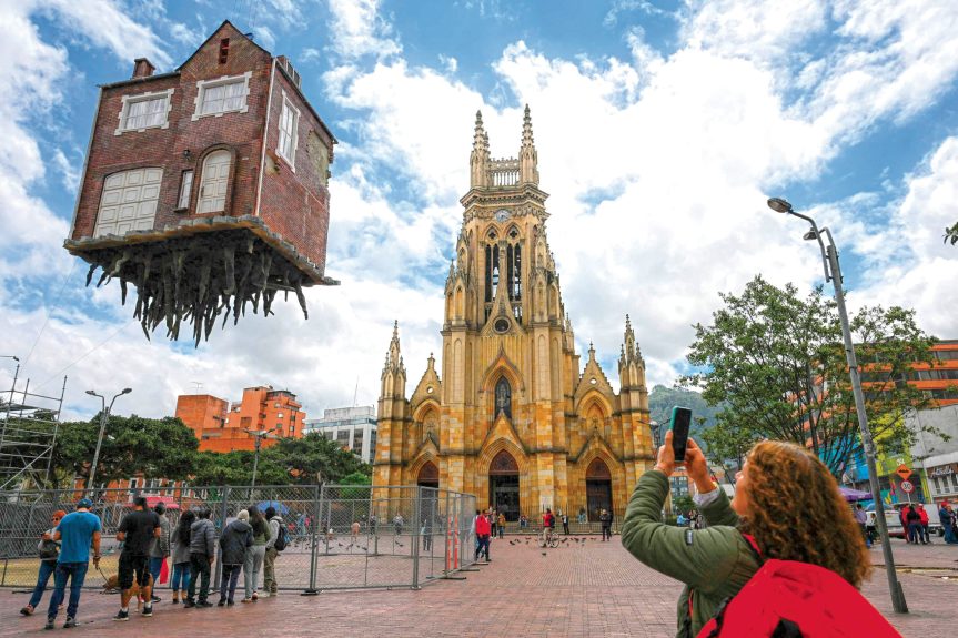 La 1ère Biennale de Bogota (Colombie) se tient du 20 septembre au 9 novembre 2025 dans la capitale colombienne. Plus de 150 artistes de 18 nationalités sont invités à investir le centre et les quartiers de la ville : interventions dans l’espace public et les édfices publics emblématiques, expositions, performances… dont cette oeuvre spectaculaire de Leandro Elrich.
