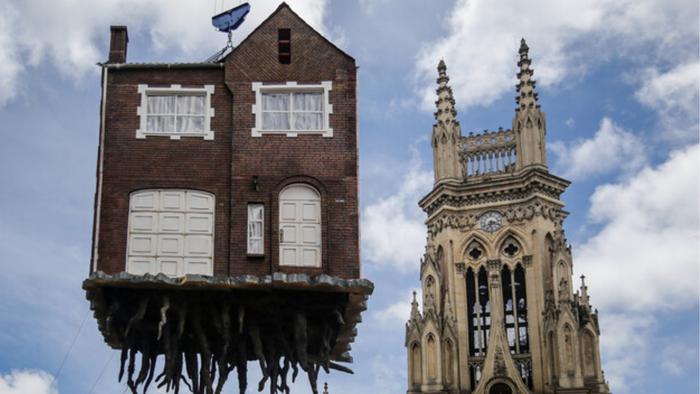 L’IMAGE DU JOUR : A la Biennale d’Art de Bogota, Leandro Erlich installe sa maison déracinée, “Arrancada de raiz”.