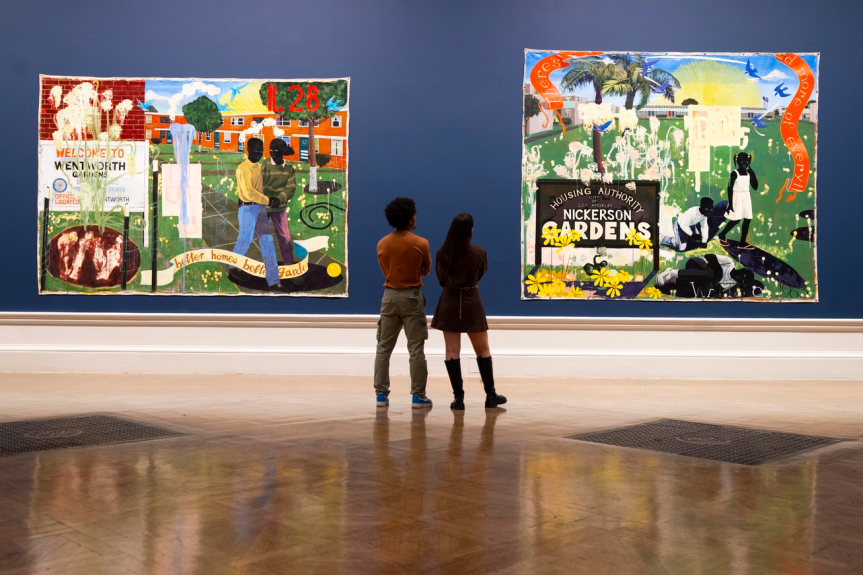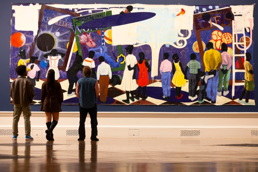 Ces peintures puissantes regorgent de références puisées dans l’histoire de l’art, la lutte pour les droits civiques, la bande dessinée, la science-fiction, ses propres souvenirs et bien plus encore. Il les utilise pour commenter le passé, célébrer le quotidien et imaginer des avenirs plus optimistes.