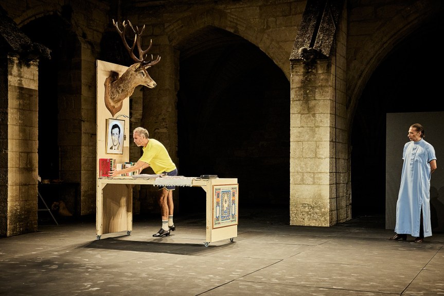 « Tribute » aux pères, donc, cette pièce commence sur un plateau presque nu, dans l’impressionnant Cloître des Carmes. Quatre écrans, deux supports en bois en forme L renversés sur roulettes de chaque côté de la scène, deux chaises oranges, avec les prénoms des deux artistes écrits en jaune, façon plateau de tournage de films, mais vraiment à petit budget tant ces sièges semblent avoir vécu…