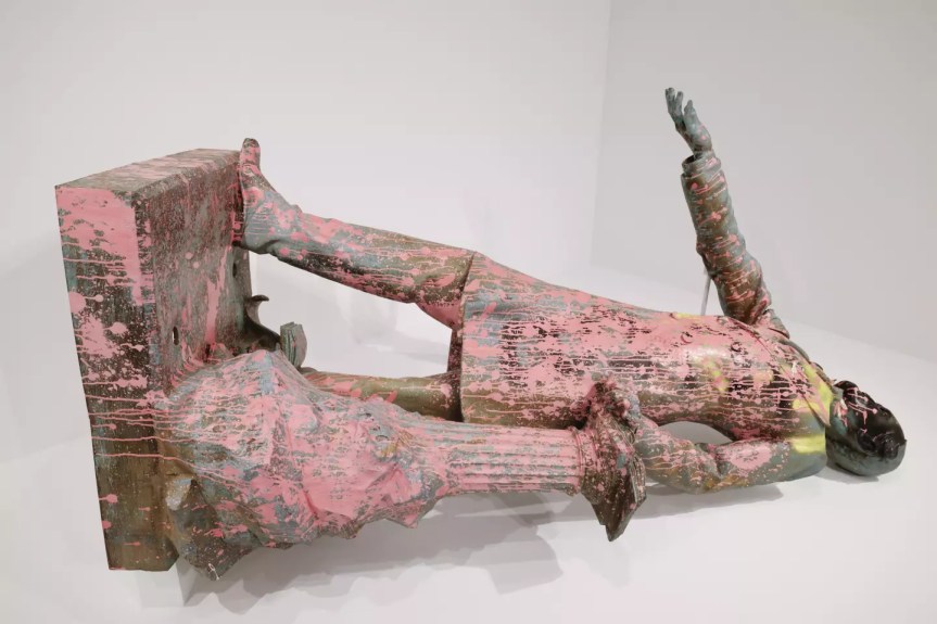 Organisée et présentée conjointement par le Museum of Contemporary Art (MOCA) et The Brick, l’exposition-manifeste MONUMENTS actuellement à Los Angeles, est pensée comme un pied de nez tonitruant à Trump et à l’idéologie MAGA, qui se mêle de tout y compris d’Art, voulant rayer d’un trait de plume les actions de déboulonnage ou de maculage des monuments dédiés aux confédérés, entrepris depuis quelques années par les contestataires de cette célébration des pires travers de la société américaine.