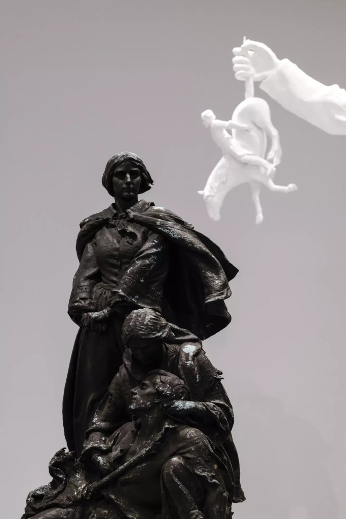 L’exposition MONUMENTS commémore donc cette récente vague de déboulonnage et de mise à bas de ces monuments grandiloquents comme un moment historique. Elle apporte ainsi une réflexion sur l’histoire et l’héritage de l’Amérique de l’après-guerre de Sécession, dont l’écho résonne encore aujourd’hui. L’exposition réunit une sélection de monuments, sculptures et statues, désaffectés, dont beaucoup sont confédérés, et des œuvres d’art contemporaines, prêtées ou créées spécialement pour l’occasion. Retirés de leur contexte public extérieur d’origine, les monuments exposés sont présentés dans leurs différents états de transformation, allant de l’état intact à des dommages importants causés par le vandalisme assumé d’opposants à cette idéologie.