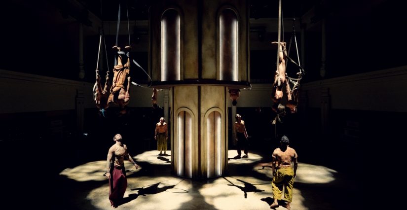 Babel suit une progression précise, qui part de la danse pour ensuite introduire les arts du cirque (mât chinois, cerceau, tissus, sangle) avant de revenir sur la terre ferme. A chaque étape, la tour change de forme, s’allonge comme un vaisseau spatial, se redessine dans les lumières sculptées. A l’humanité qui se bat pour survivre succèdent des faits d’armes précis et lumineux, des singularités à la beauté salvatrice. Le numéro des cerceaux est particulièrement touchant, irréel et magique, avec ces deux silhouettes chacune sur leur accessoire qui enchainent les poses les plus folles, flirtent avec le public en se balançant dans les airs. Tissus et sangles sont tout aussi fascinants. La lumière se fait sur les corps, qui quittent leurs vêtements bruns et rouges de réfugiés pour adopter un jaune seyant. Les visages s’apaisent dans la beauté.
