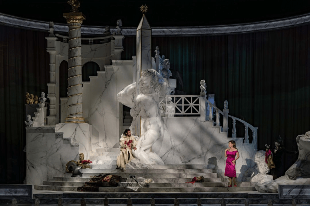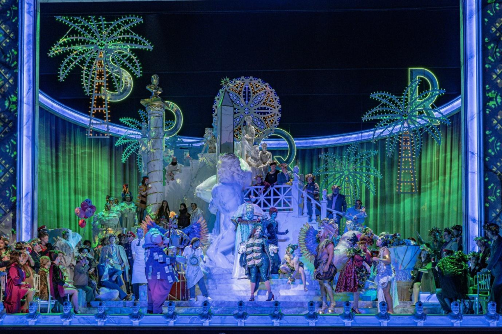 Soyons clairs dès le départ : ce spectacle est tout simplement stupéfiant, avec son décor gigantesque et ses costumes fabuleux (un an de travail pour les ateliers de La Monnaie et deux ans pour les costumiers). La scène se métamorphose en une immense sculpture, représentant tour à tour la fontaine de Trevi, une colline romaine, la statue de Persée, et même un temple, intégrant des éléments générés par intelligence artificielle (vidéos). Le lustre et les fresques du plafond du théâtre de La Monnaie s’animent et deviennent partie intégrante du spectacle. Dans sa mise en scène, Strassberger (*) joue avec le décalage temporel en introduisant des personnages déguisés en soldats, un footballeur, des hippies, en Amérindiens, des ménagères, des pizzaiolos, un pape brandissant un phallus géant en guise d’anneau… (une scène plutôt vulgaire), transformant la scène en un carnaval kitsch et éclectique qui déborde de toutes parts… Oserait-on dire un peu « trop » ? Deux drag queens animent la scène du carnaval, avec un intermède parlé qui s’étire un peu… Le public, perplexe, peine à saisir l’ensemble, tant les détails sont nombreux et l’effervescence omniprésente. Il faut le dire, l’atmosphère est incroyable ! Le ténor John Osborne est brillant dans le rôle-titre de Cellini, et la soprano Ruth Iniesta est sublime en Teresa. L’orchestre, dirigé par Altinoglu, est superbe.