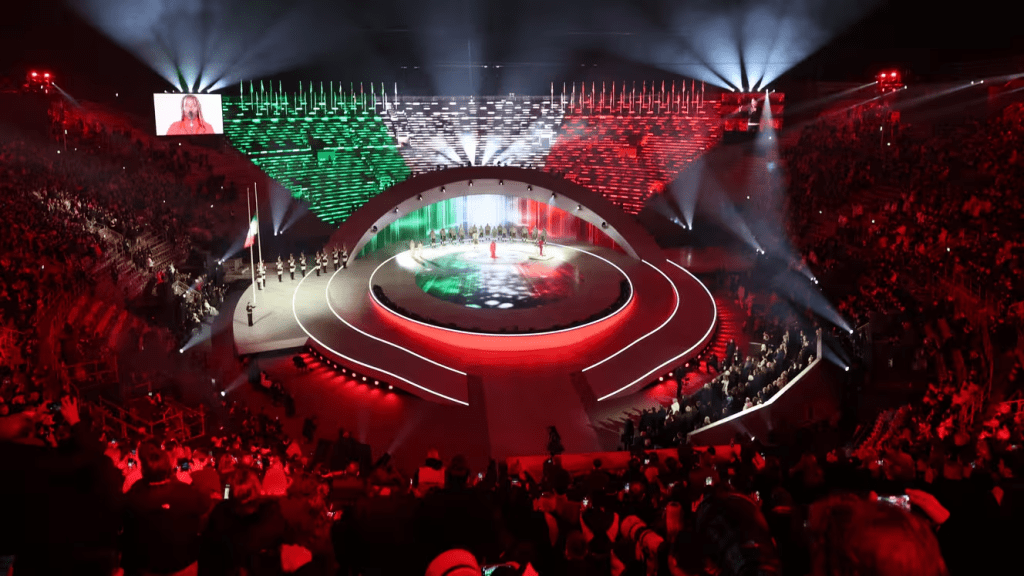 Images: en haut, le Pavillon national russe à la 61e Biennale de Venise – en bas : les arènes de Vérone où se tenait la cérémonie des Jeux paralympiques ce samedi 6 mars – photos Biennale de Venise et DR