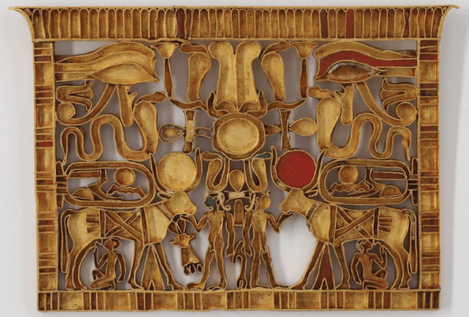 Images: 1- Vue intérieure du temple aux Obélisques de Byblos. © Philippe Maillard / IMA – 2- Vue intérieure du temple aux Obélisques de Byblos. © Philippe Maillard / IMA – 3- Pectoral avec Hathor inscrit au nom du pharaon Amenemhat III, Byblos, 1818-1773 avant J.-C. (XIIe dynastie), or, Ministère de la Culture / Direction Générale des Antiquités du Liban, ©IMA